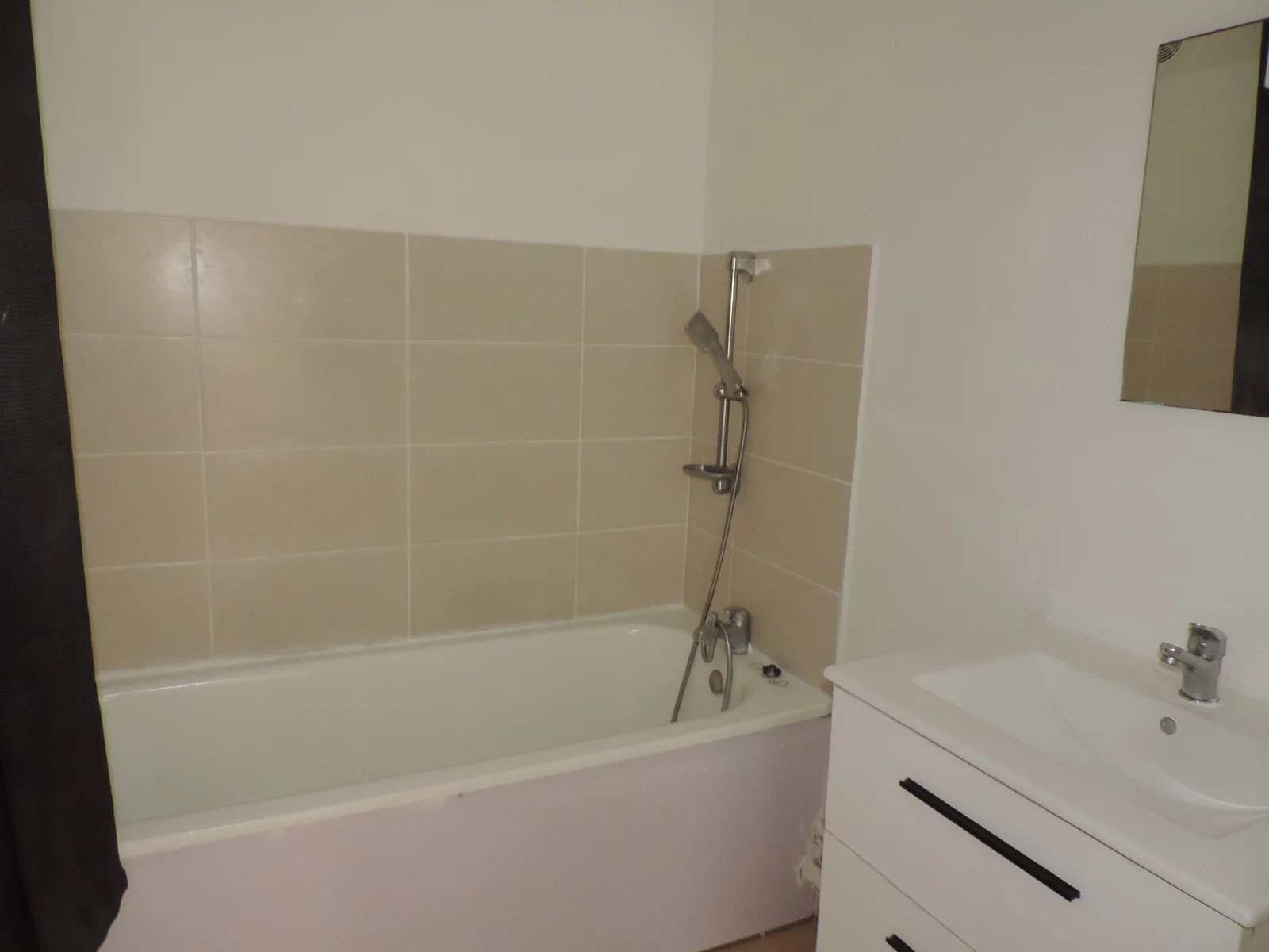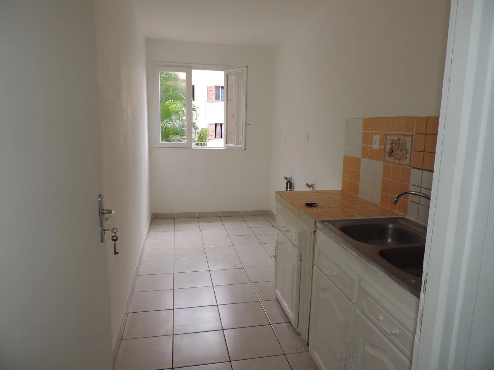 1 Séjour, 1 cuisine avec évier et placards, 1 Salle de bains avec baignoire, 1 vasque, 1 WC