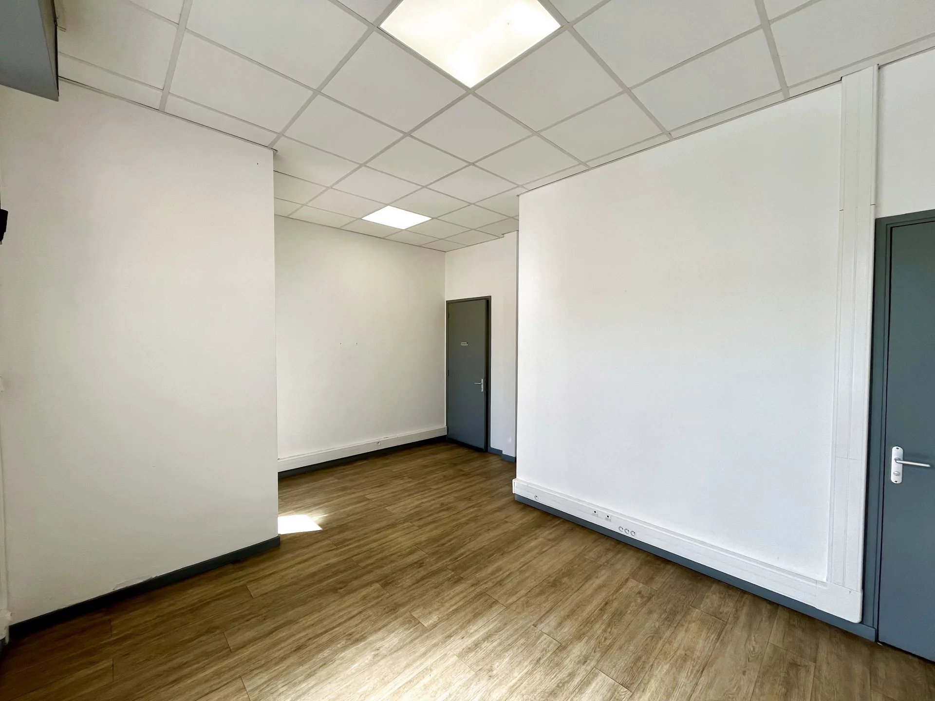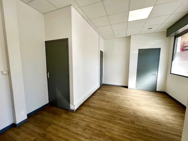 L'entrée donne accès à une salle d'environ 18 m2 spacieuse et lumineuse grâce à la présence d'une grande vitrine avec volet roulant électrique. Cette salle dispose de deux toilettes dont une avec un accès pour personnes à mobilité réduite.