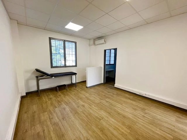 Dans le prolongement, une pièce d'environ 18 m2, pouvant faire office de salle de consultation est équipée d'une grande fenêtre, de la climatisation et d'un lave mains.